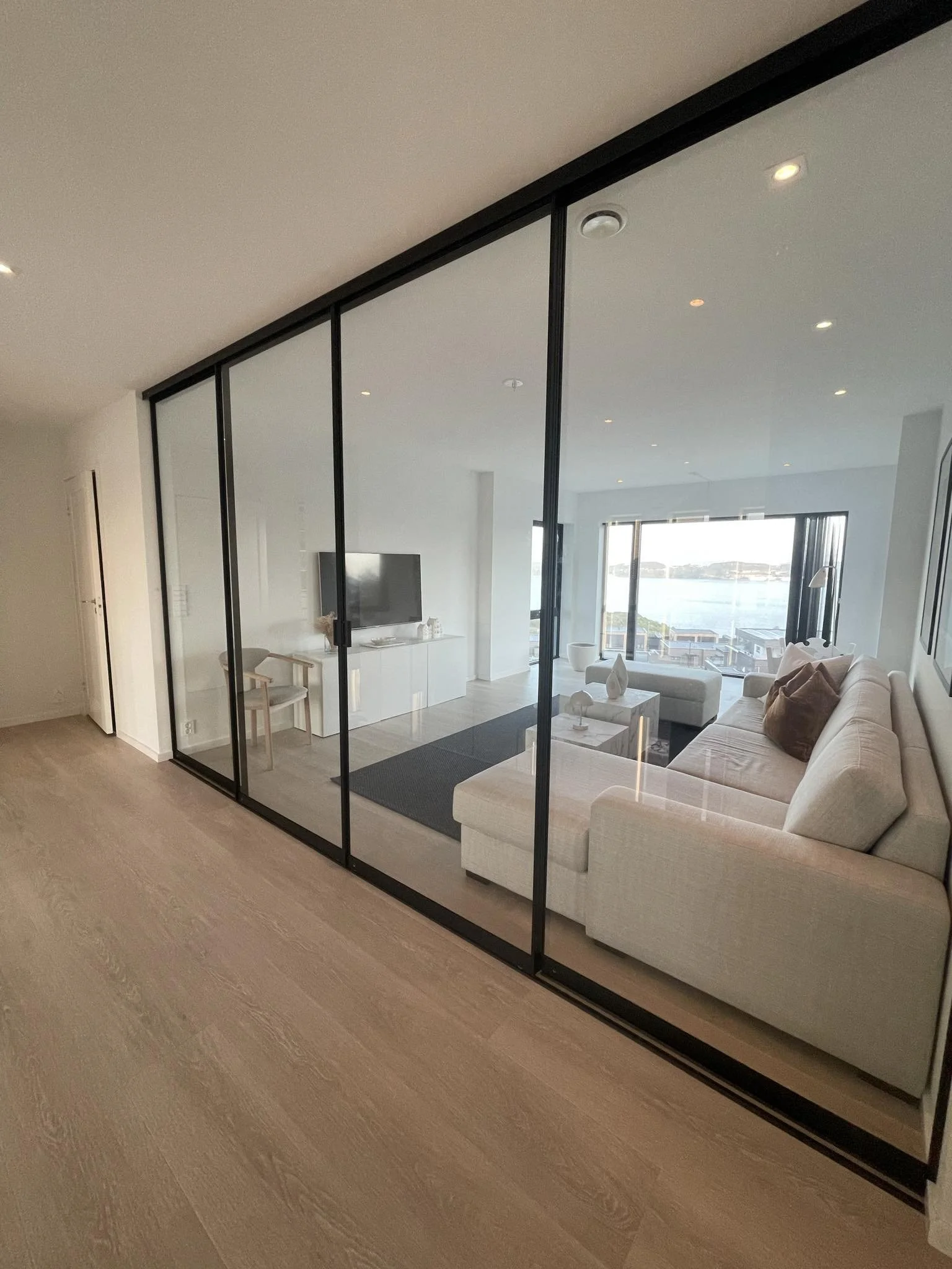 Skyvedørsfronter kan også brukes som romdeler. Skyvedørsfronter kjører på gulvskinne, så denne løsningen vil gi en skinne på gulvet. Skyvedører som romdeler er fleksibelt og praktisk, og gjør at du beholder lyset og romfølelsen, samtidig som hjemmet kan deles opp i ulike soner.